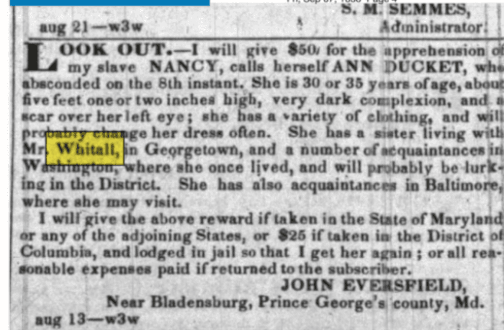 Grace Ann (Gracie) Duckett was born between 1790 and 1791 in Maryland to unknown parents. Little is known about her early life, and it is almost certain that she was born enslaved to the Eversfield family in Nottingham, Maryland, where she remained enslaved until Charles Eversfield died in 1820. While enslaved by the Eversfields, on April 8 1821, Gracie gave birth to her first child, Emiline Duckett. Gracie was then separated from her sister Nancy Ann Duckett (sometimes listed as Ann Duckett), who continued to be enslaved by the Eversfield family in Prince George’s County until 1836 when she escaped, as evidenced by newspaper advertisements offering $50 for her apprehension. It is unknown what happened to Nancy Ann Duckett after her escape as no records of her have been found after 1836. Gracie was sold to Samuel and Lydia Whitall in between 1820-1822 where she was enslaved in Georgetown until 1862. While enslaved by the Whitalls, Gracie’s children Henry and Julia were born in 1821 and 1824, yet it is unknown who their fathers were (DC History Center MS 0725.1298).