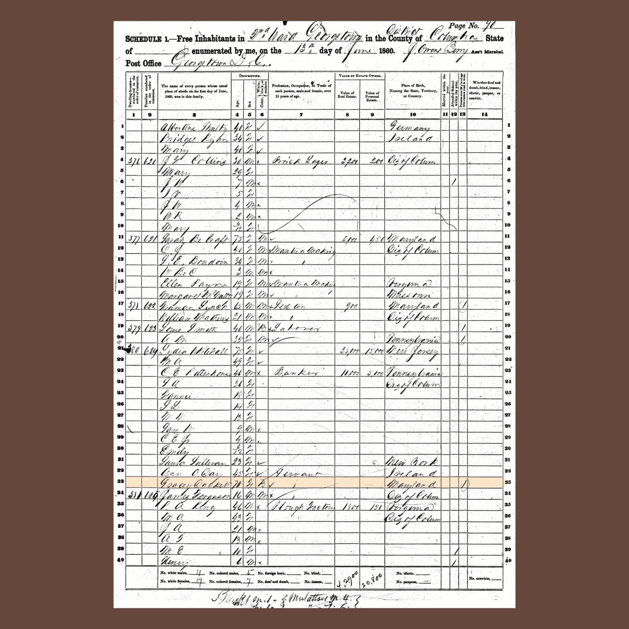 United States Census Bureau. “Schedule I: Free Inhabitants in Georgetown, District of Columbia, 13 June 1860.” 1860 U.S. Federal Census, manuscript page image, National Archives and Records Administration