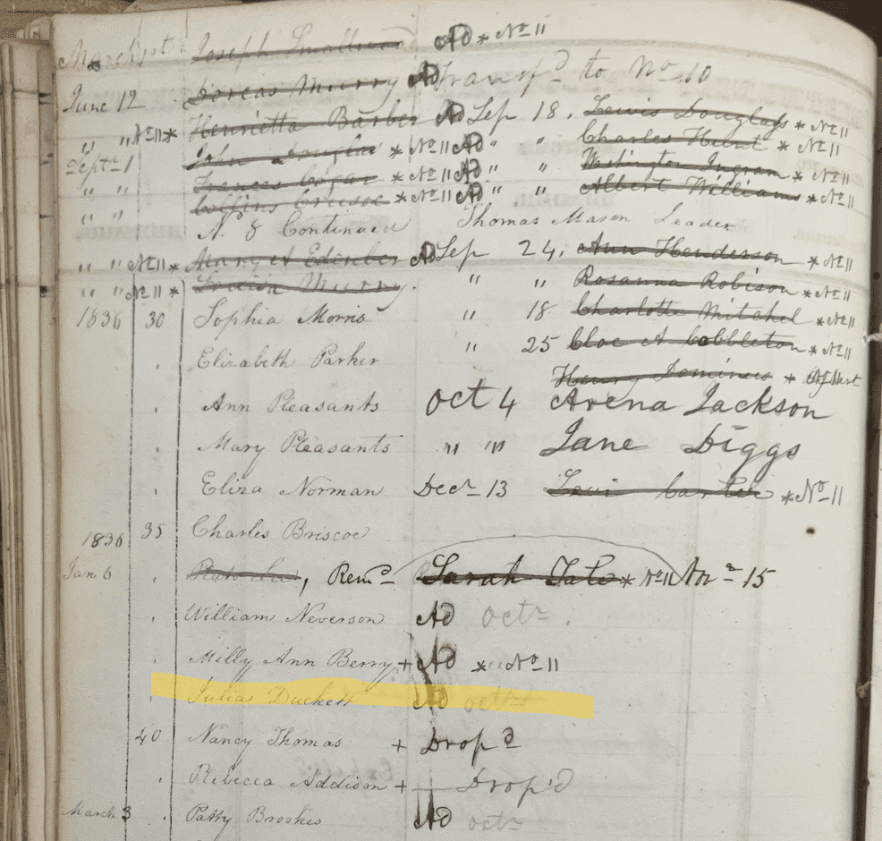 While enslaved by the Whitall family, Gracie’s reality differed greatly from what she experienced when owned by the Eversfields: urban slavery allowed free and enslaved black populations to be in constant contact, and as such Gracie and her family were amidst a community of both free and enslaved Black people. Gracie and her daughter Julia are listed as members of the Black congregation at the Mt. Zion Methodist Church, where Reverend Joseph Cartwright served as a preacher. Further, records indicate that Gracie’s daughter, Mary Duckett, attended Sabbath School at 15 years old in 1848.
