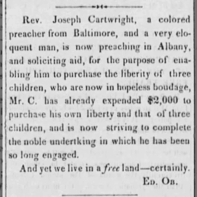 On December 13, 1819, Reverend Cartwright purchased his freedom from a John Rose in Lessburg, Loudoun County, Virginia, with wages earned through a combination of preaching in the local Methodist community, community support, and possibly small payments for his services. After manumission, he dedicated his life to buying the freedom of his wife and children with wages he earned as a travelling preacher. In 1823, he purchased the freedom of his wife, Sussanah (Sucky) Cartwright and his son Alfred Cartwright. Over the next 16 years, he worked as a travelling preacher, raising money to buy the freedom of the rest of his children from different enslavers across Maryland and Virginia. In 1839, he purchased the freedom of his last child, Nora, and manumitted the entire family in that September. Notably, in 1840, he appealed to John Quincy Adams to help free his grandchildren, a meeting Adams recorded in his diary.