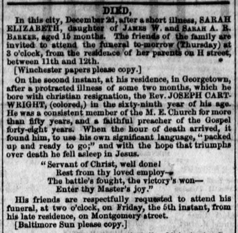 Reverend Joseph Cartwright Sr. was born on July 13, 1783 in Virginia to father Hamilton Cartwright, aged 28, and an unknown mother. He was born enslaved, possibly to the Rose family, and labored on their plantation in Leesburg, Loudon County, Virginia. Joseph Cartwright and Susanah (Sucky) Wilson, a fellow enslaved laborer, were married on December 16 or 26, 1800, in Maryland, likely near Georgetown. Over the span of the next twenty-two years, they had ten children—Alfred, Charles, Hamilton, Joseph W., Lewis Sr., Nora Ann, Mary Sophia, Phoebe, William, and Wilson—all of whom were born into bondage. On December 5, 1850 Susanah Wilson passed and was buried in the Mount Zion Cemetery in Georgetown D.C. On December 2, 1851 Reverend Joseph Cartwright passed away at age 68 and was buried alongside his late wife in the Female Band Union Cemetery.