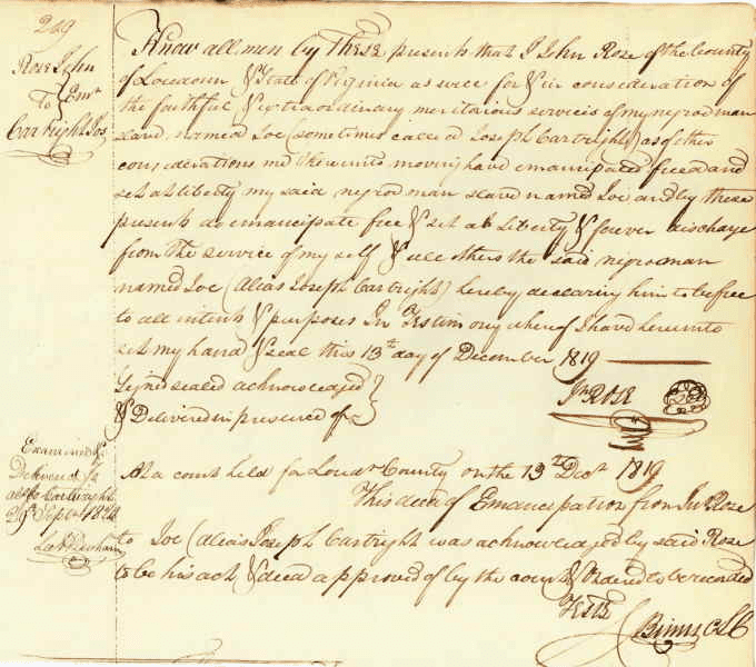 Rose, John. Manumission of Reverend Joseph Cartwright Sr. 1819, Loudoun County, Virginia. Manuscript document.